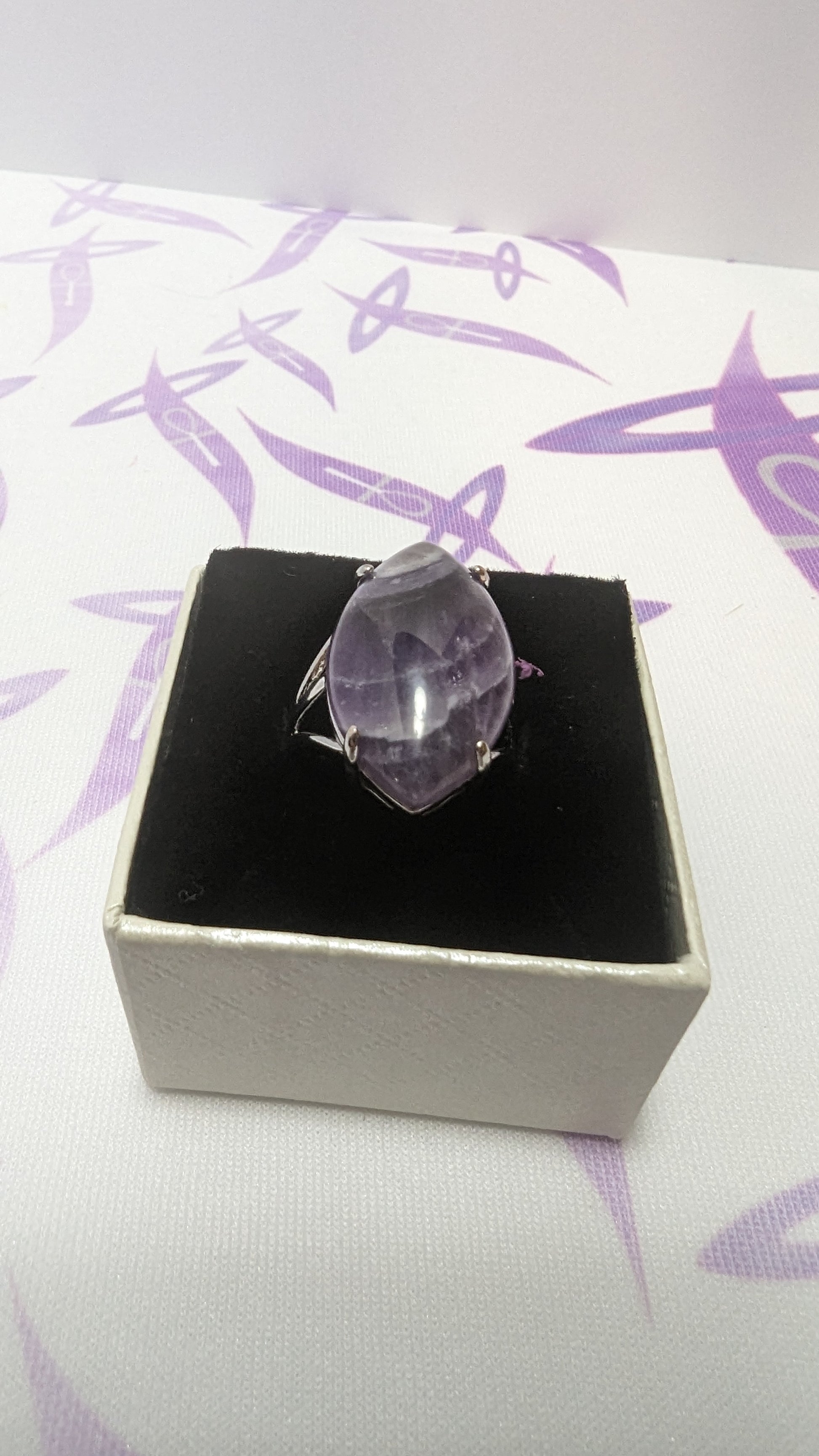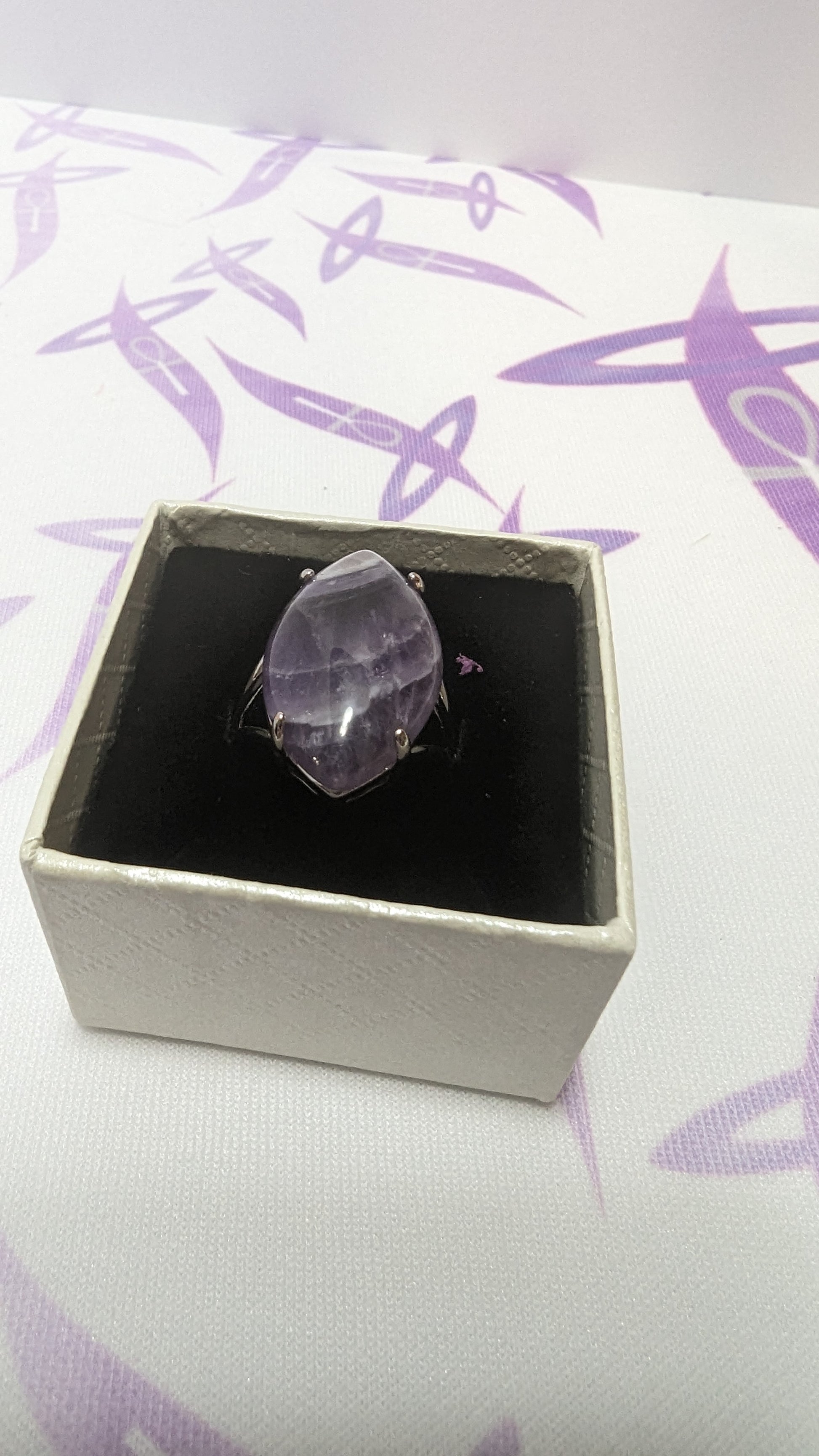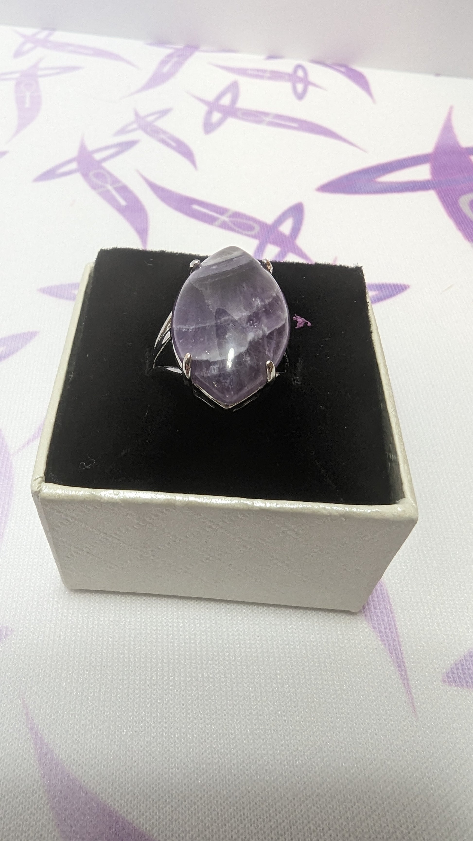 Silver ring with adjustable fitting. Large Genuine pointed oval shaped crystal.