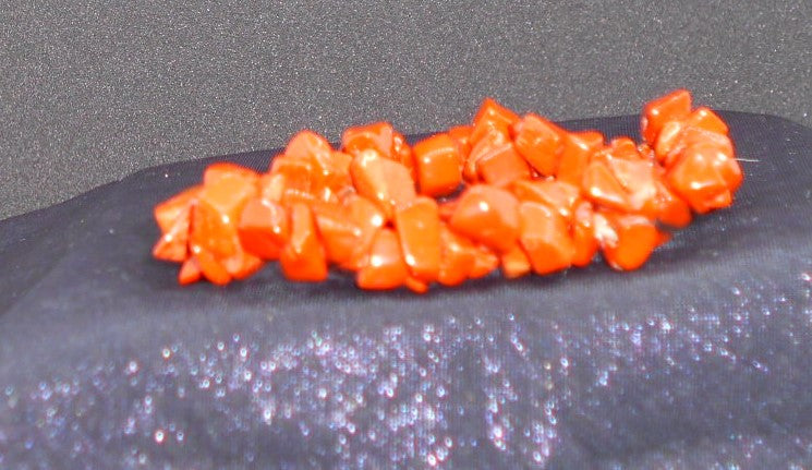 Gorgeous Crystal Chip Carnelian bracelet small-med chips sized crystals. Carnelian lends the courage needed to help overcome difficulties and defend a cause. It promotes idealism, a sense of community, and pragmatism. Carnelian is said to attract prosperity, new resources, and good luck. It is a talisman for success in any money-making venture. Carnelian is a crystal of action. It encourages one to stop waiting for dreams to appear and stimulates the courage to embrace change.