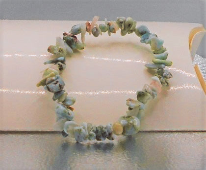 Gorgeous Crystal Chip Larimar bracelet small chips sized crystals. Larimar is the embodiment of the tranquil Sea and Sky energies. A mix of blues, greens and greys making up the changes in colour depth of the sea and changing colours of the sky. Larimar is sometimes also called the Atlantis Stone because of its ocean-like qualities. Larimar is a crystal of serenity, promoting relaxation in every aspect. Use as a worry stone, or place in the home or workplace to assure a pleasant atmosphere. It promotes clear and confident communication with health personnel. As a soothing Water element stone, Larimar may cool hot tempers and assist them in finding peace. As a crystal of the Throat Chakra it helps guide the voice of one’s deepest wisdom. Singers may also find Larimar a wonderful talisman for enhancing and protecting the voice.