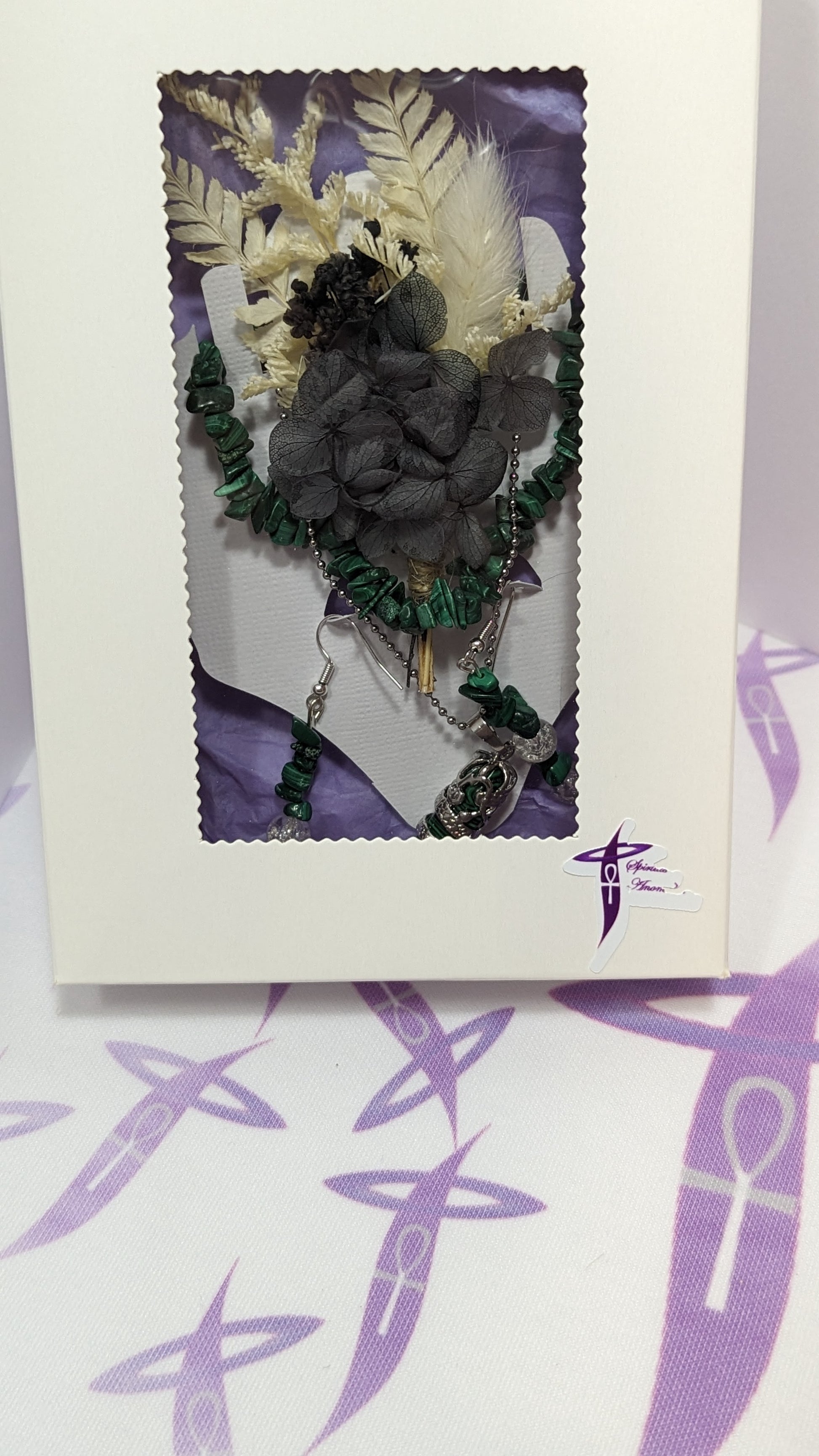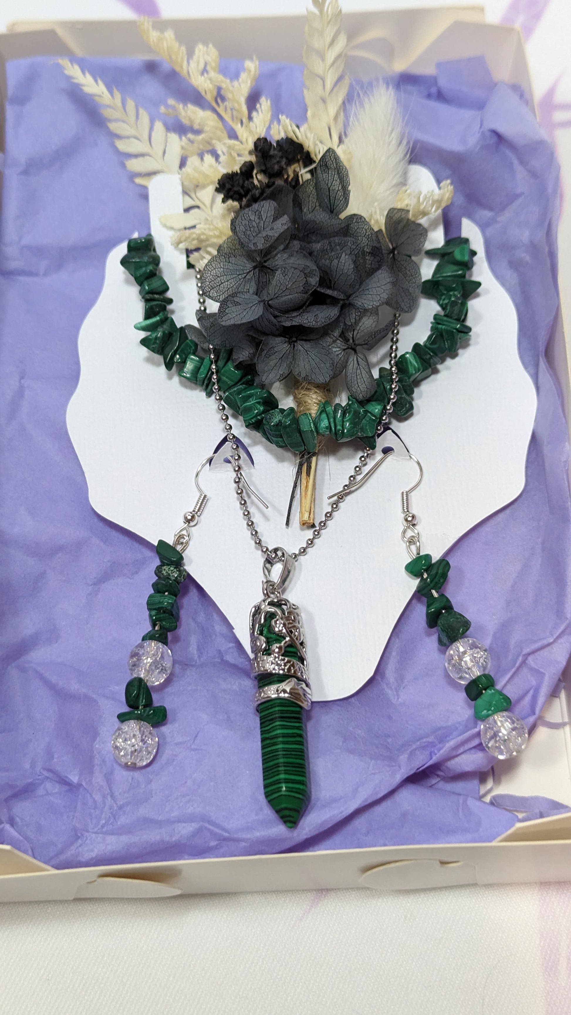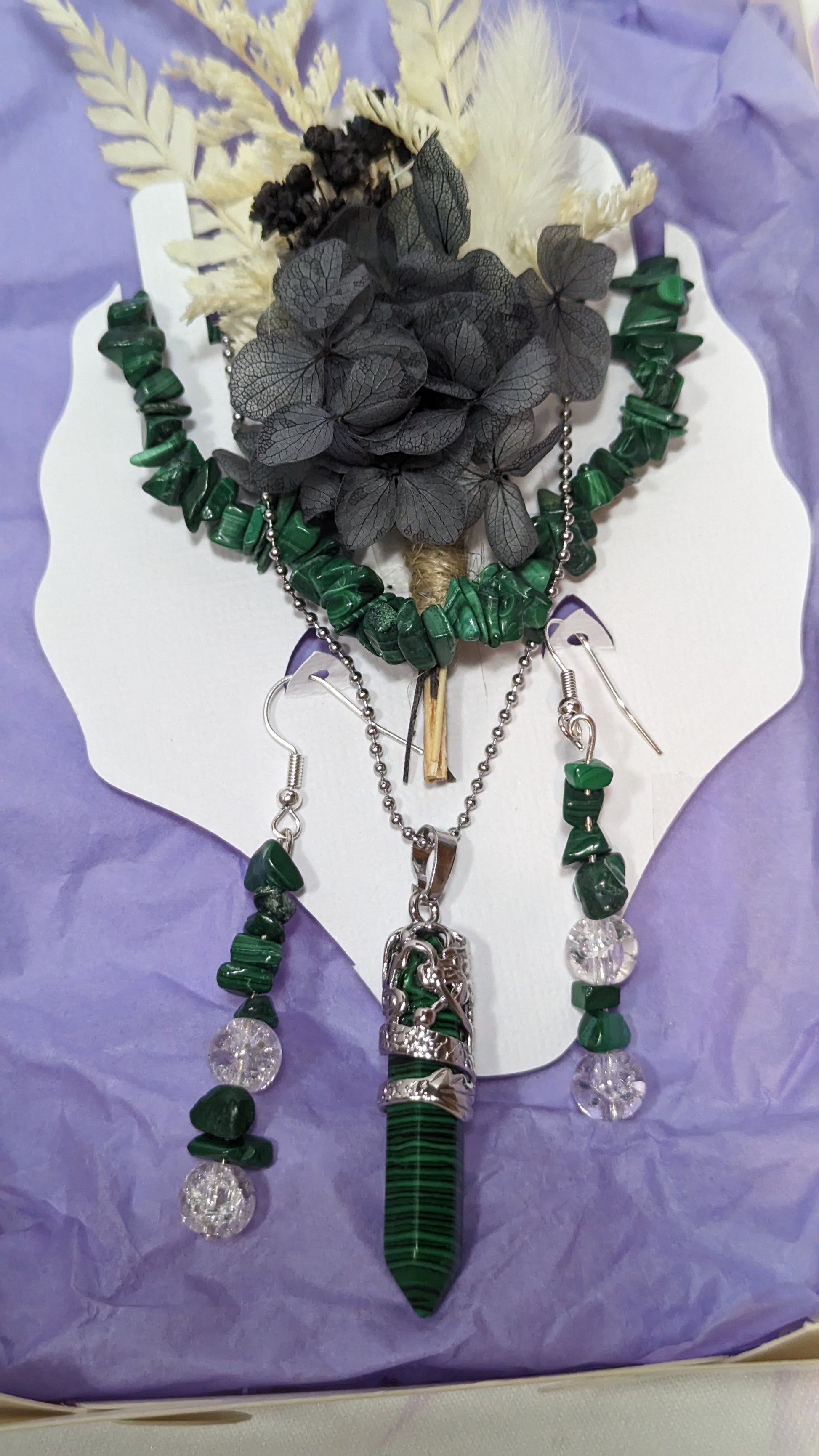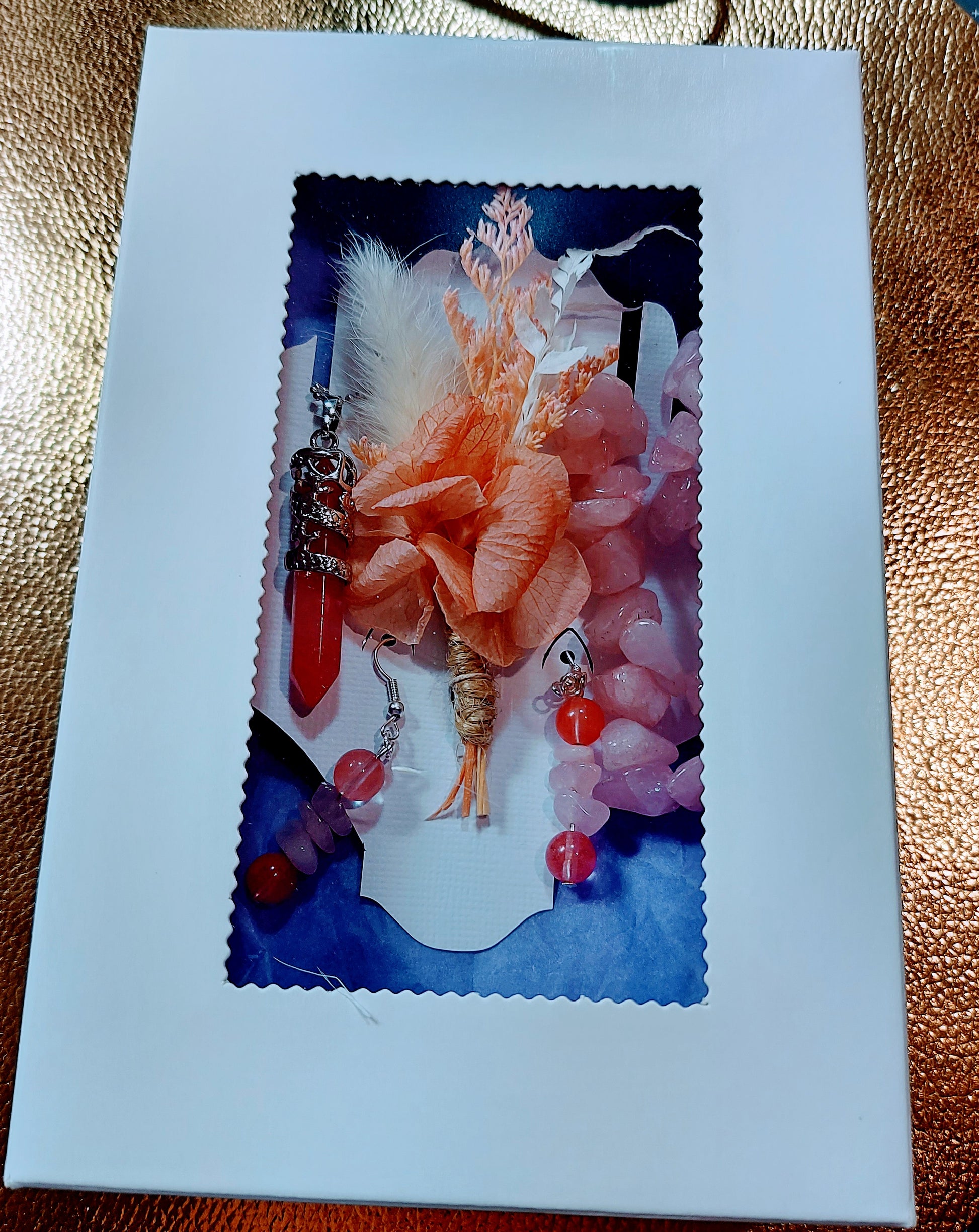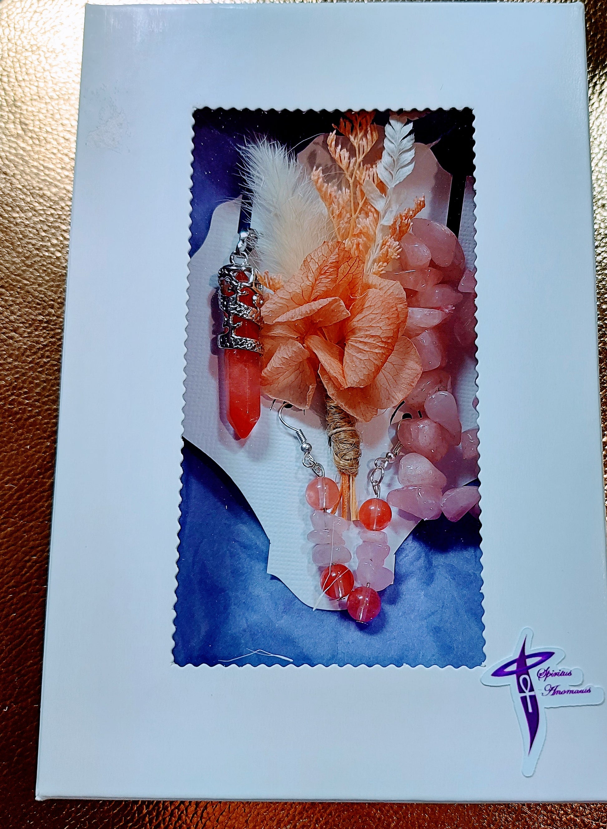 1 Pendant, 1 Bracelet and 1 pair of dange Earrings for pierced ears plus a memento posy as a reminder of affection.