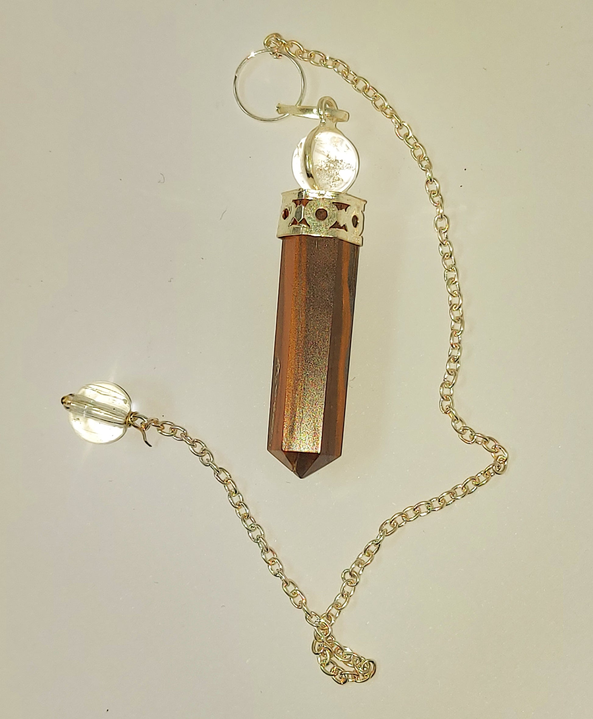 This a Pendulum but could be placed onto a chain to wear. This pendulum/pendant is hexagonal Tigers Eye prism with 1clear quartz ball.